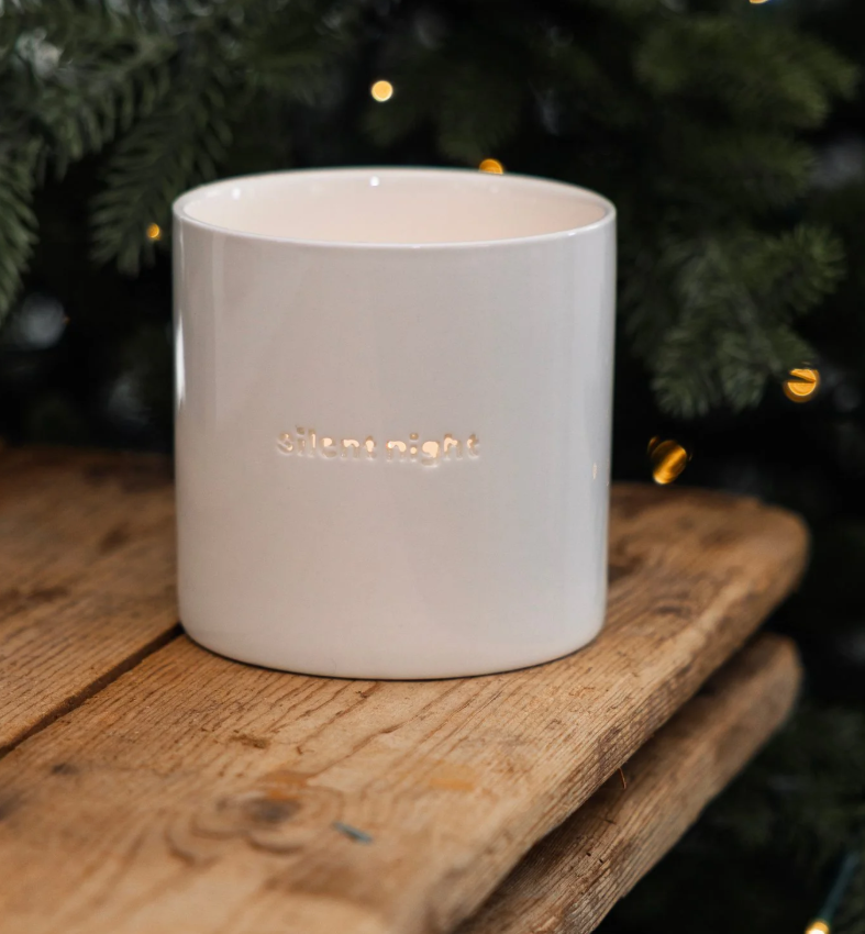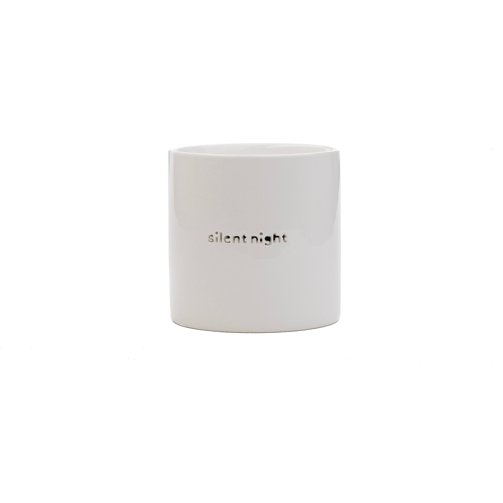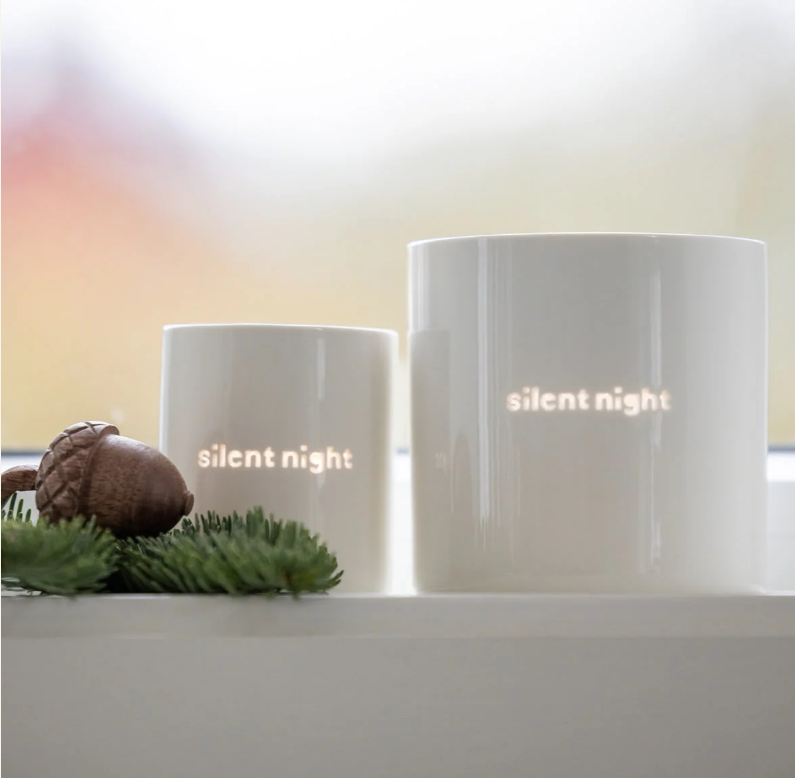 Fallegt og stílhreint kertaglas frá SÖGNE úr þunnu postulíni með fallega textanum SILENT NIGHT. Kertaglösin gefa frá sér fallega birtu.